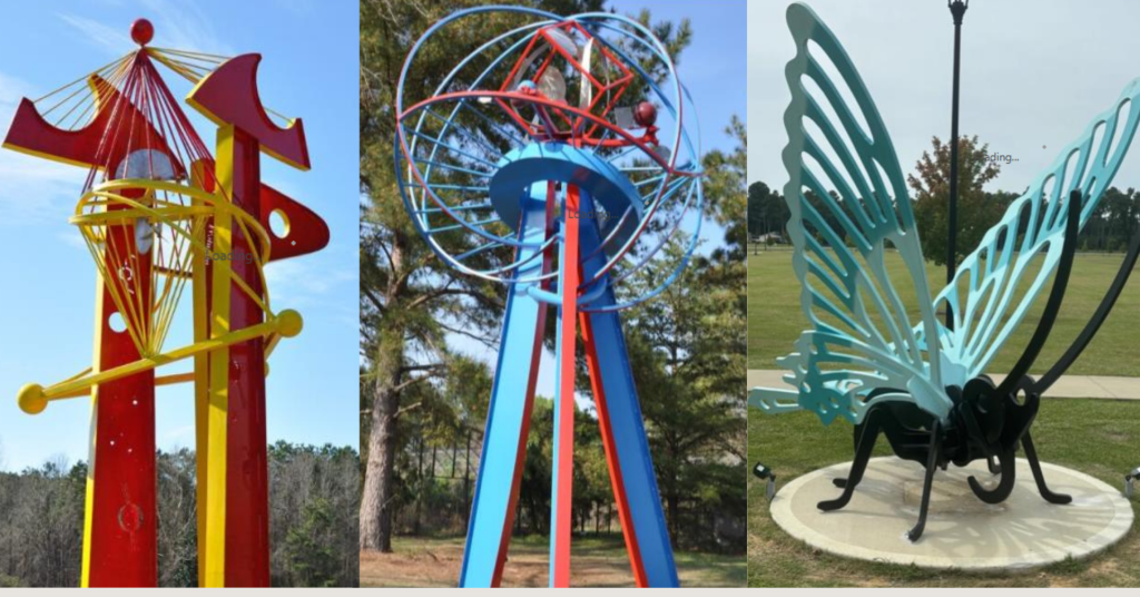 This year’s finalists include two compelling works by internationally acclaimed sculptor and East Carolina University professor Hanna Jubran, “Solar System” and “3 Planets,” alongside the option to retain the current installation, “Blue Butterfly,” by Benton & Sons Stainless Steel Fabrication.